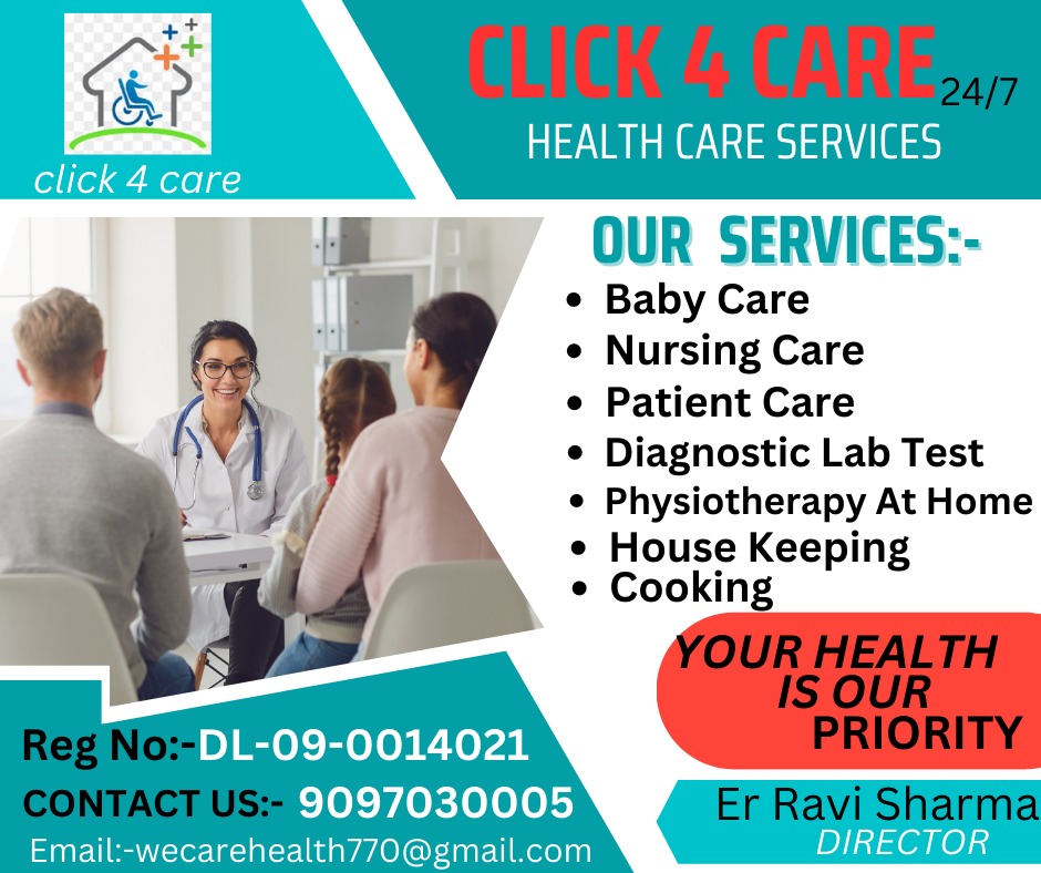 Click4Care health care services engaged in providing qualified patient care to clients. We ensure that the patient care taker we place with clients have expertise in the domain and can efficiently take care of the patients. We are best in this field. We provide professional,trained male and female attendent to provide good health care to our clients.